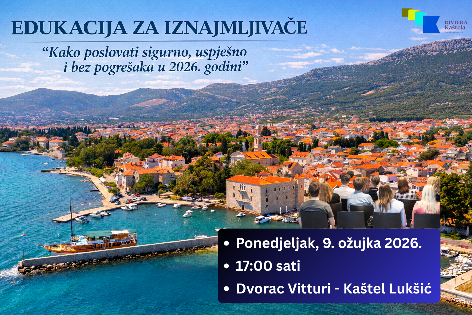 Turistička zajednica grada Kaštela poziva sve privatne iznajmljivače na stručnu i izrazito praktičnu edukaciju koja će se održati u ponedjeljak, 9. ožujka 2026. godine, u 17:00 sati, u predivnom ambijentu Dvorca Vitturi u Kaštel Lukšiću.